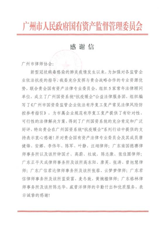 服务:充分发挥专业优势,助力复工复产。九游官方网站汪翊律师作为广州市律师协会国有资产法律专业委员会的成员之一,积极投身广州国资系统“抗疫暖企”公益法律服务团,参与编写了《广州市国资委监管企业依法有序复工复产常见法律风险防控参考指引》, 并得到广州市国资委的诚挚感谢。